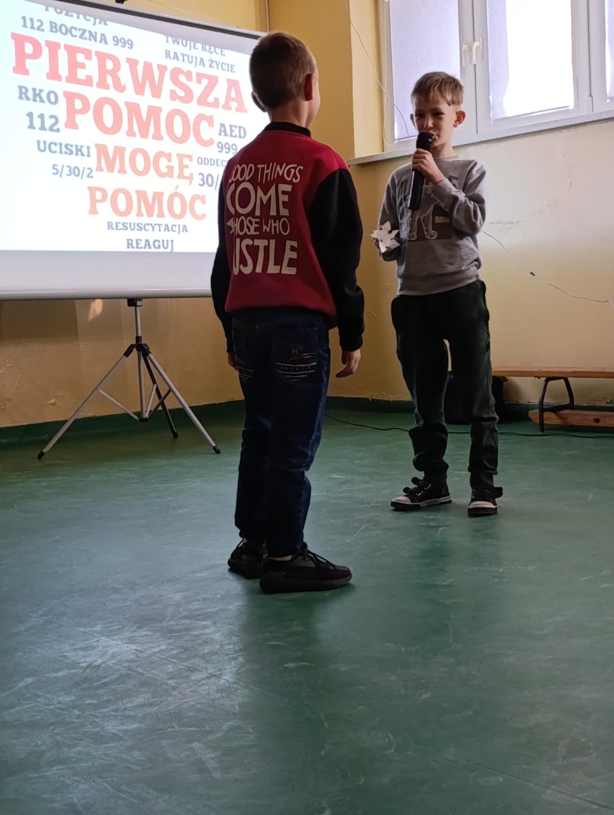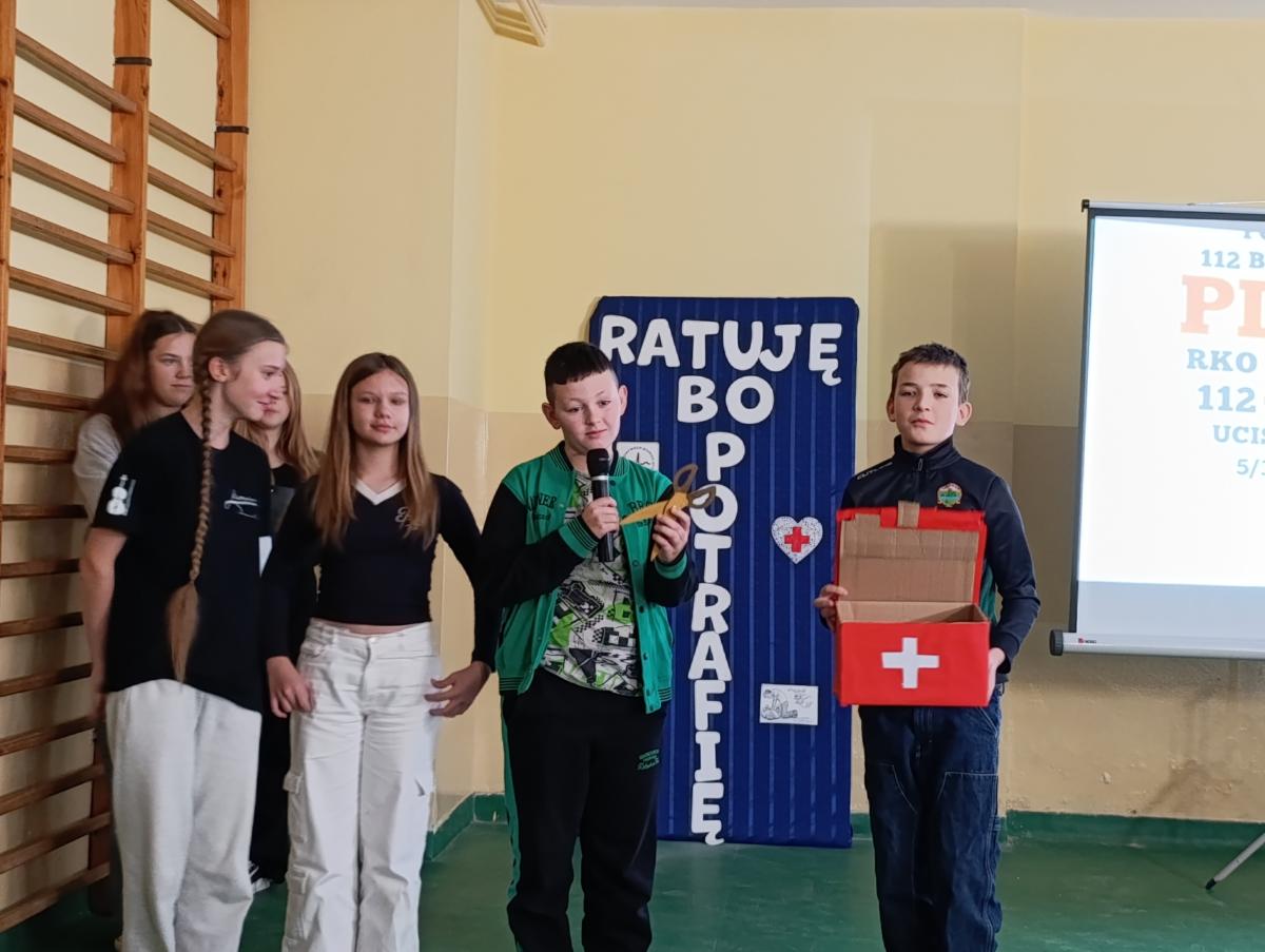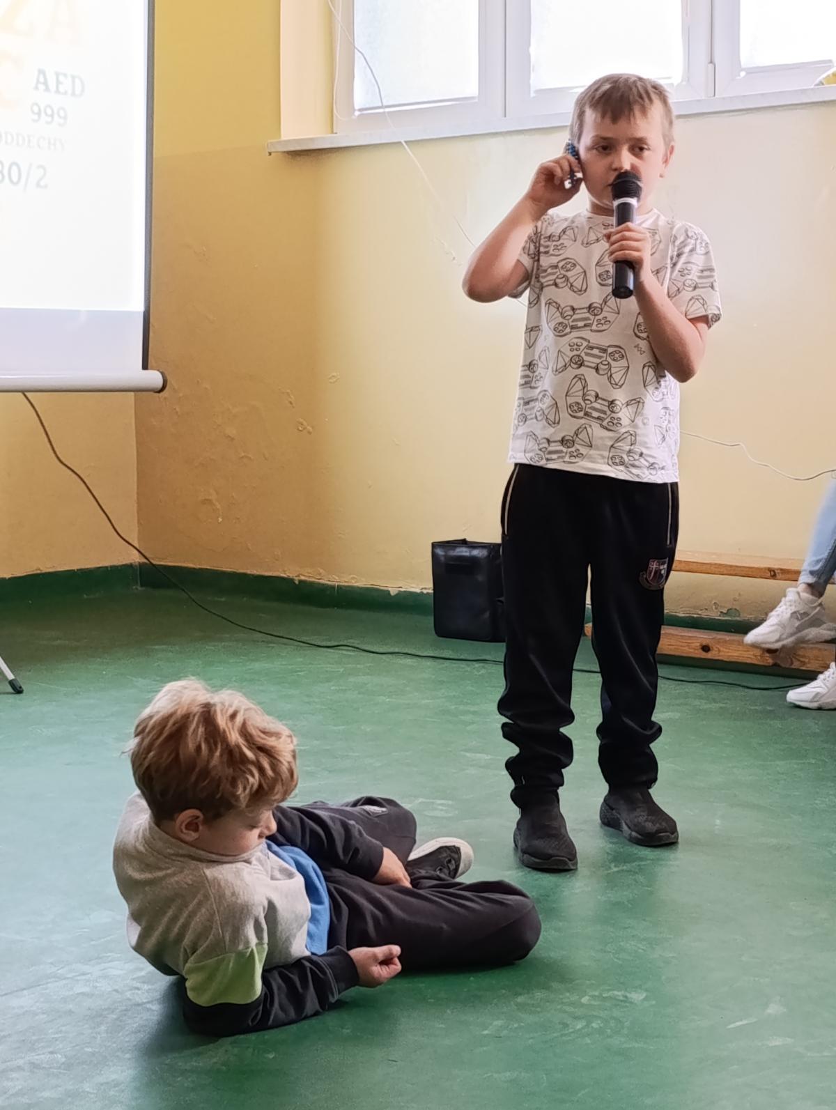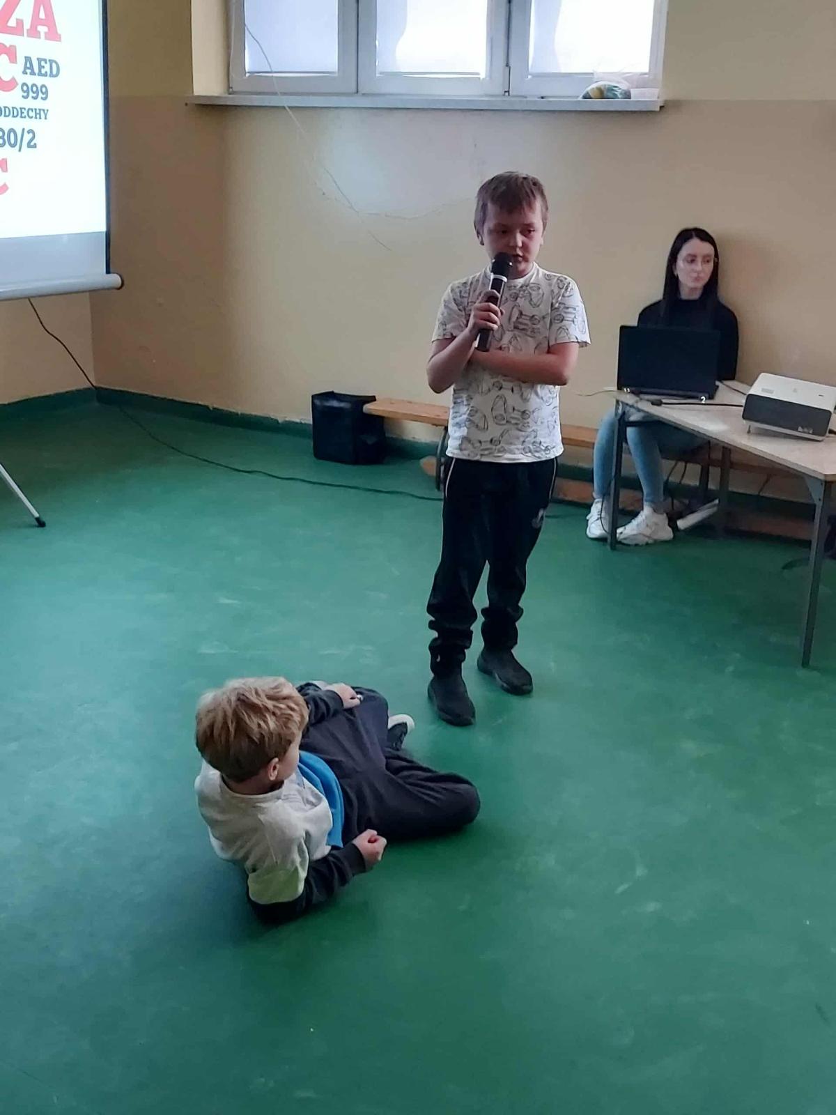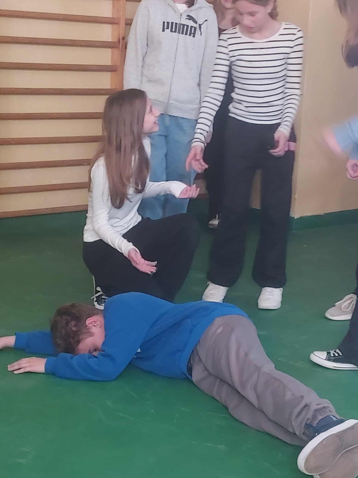 Następnie uczniowie klas I–III przedstawili scenki sytuacyjne, w których pokazali, jak udzielić pomocy koledze, który się przewrócił, jak właściwie opatrzyć drobną ranę oraz jak zachować spokój w trudnych sytuacjach. Ich występy były nie tylko pouczające, ale także pełne zaangażowania.