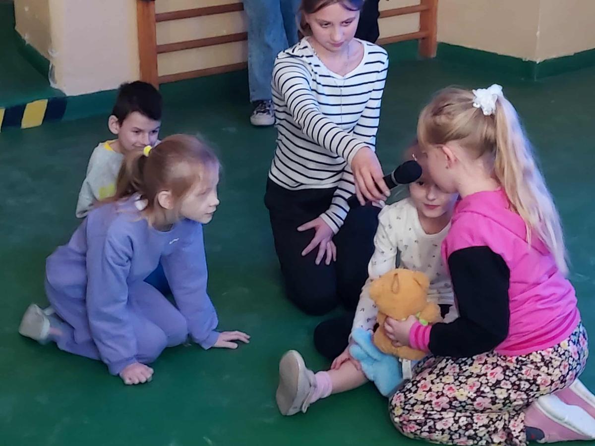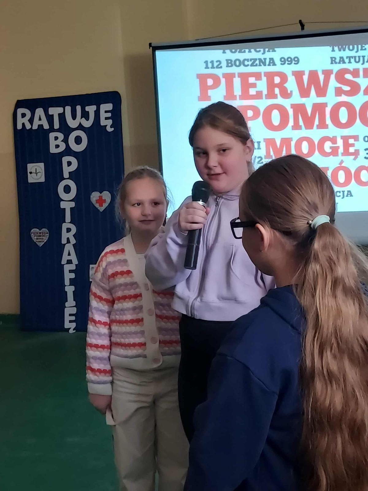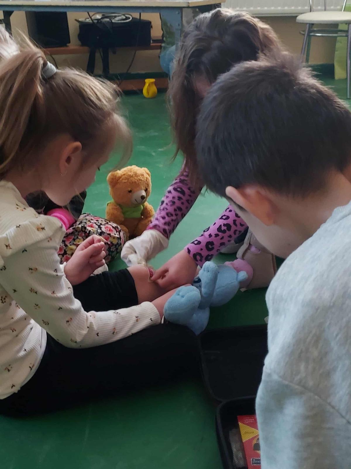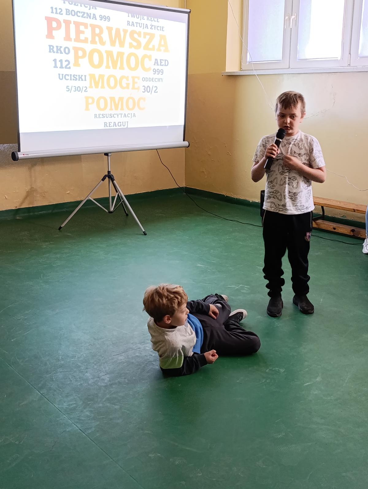Następnie uczniowie klas I–III przedstawili scenki sytuacyjne, w których pokazali, jak udzielić pomocy koledze, który się przewrócił, jak właściwie opatrzyć drobną ranę oraz jak zachować spokój w trudnych sytuacjach. Ich występy były nie tylko pouczające, ale także pełne zaangażowania.