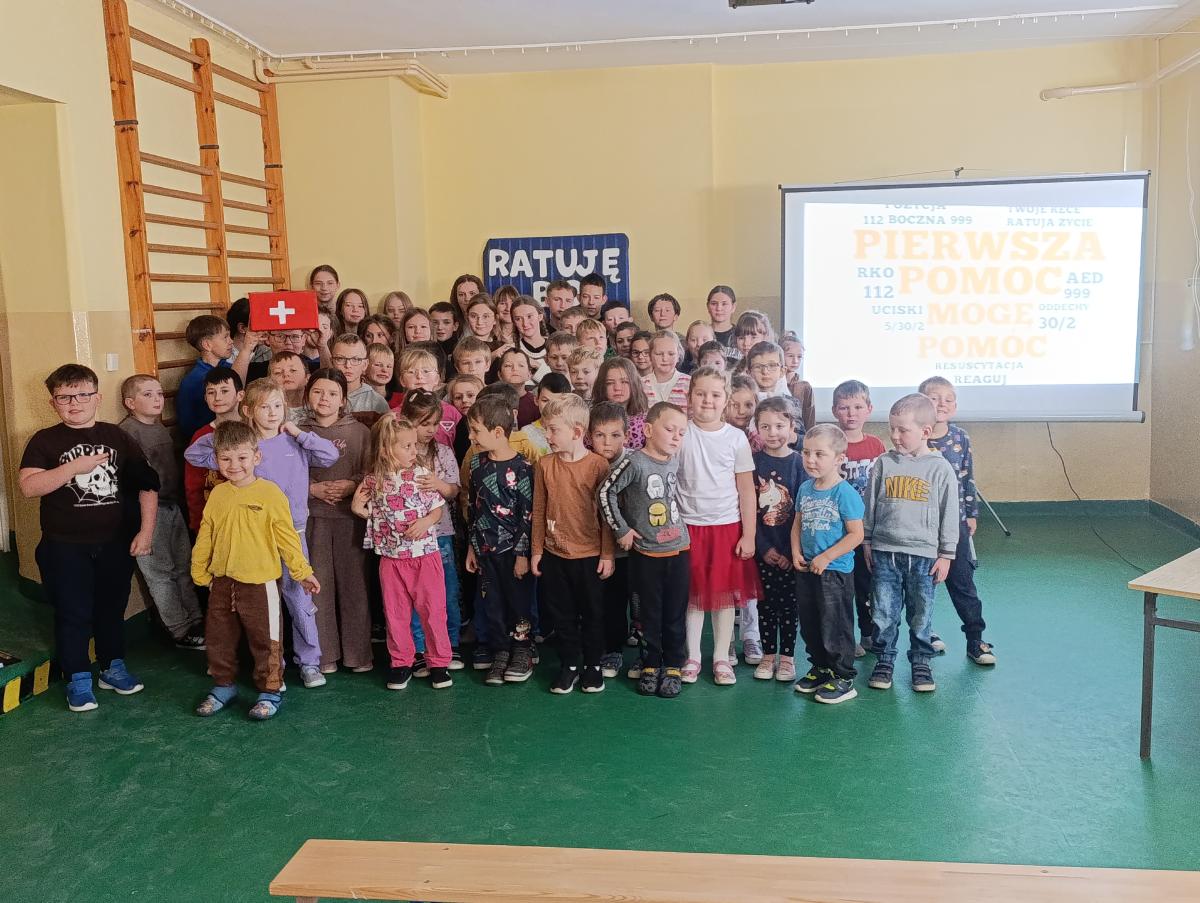 W naszej szkole odbył się uroczysty apel poświęcony zasadom udzielania pierwszej pomocy. W wydarzeniu wzięli udział zarówno najmłodsi – dzieci z oddziału przedszkolnego – jak i uczniowie klas I–VIII. Celem apelu było przypomnienie, jak ważna jest umiejętność szybkiego i właściwego reagowania w sytuacjach zagrożenia zdrowia lub życia.