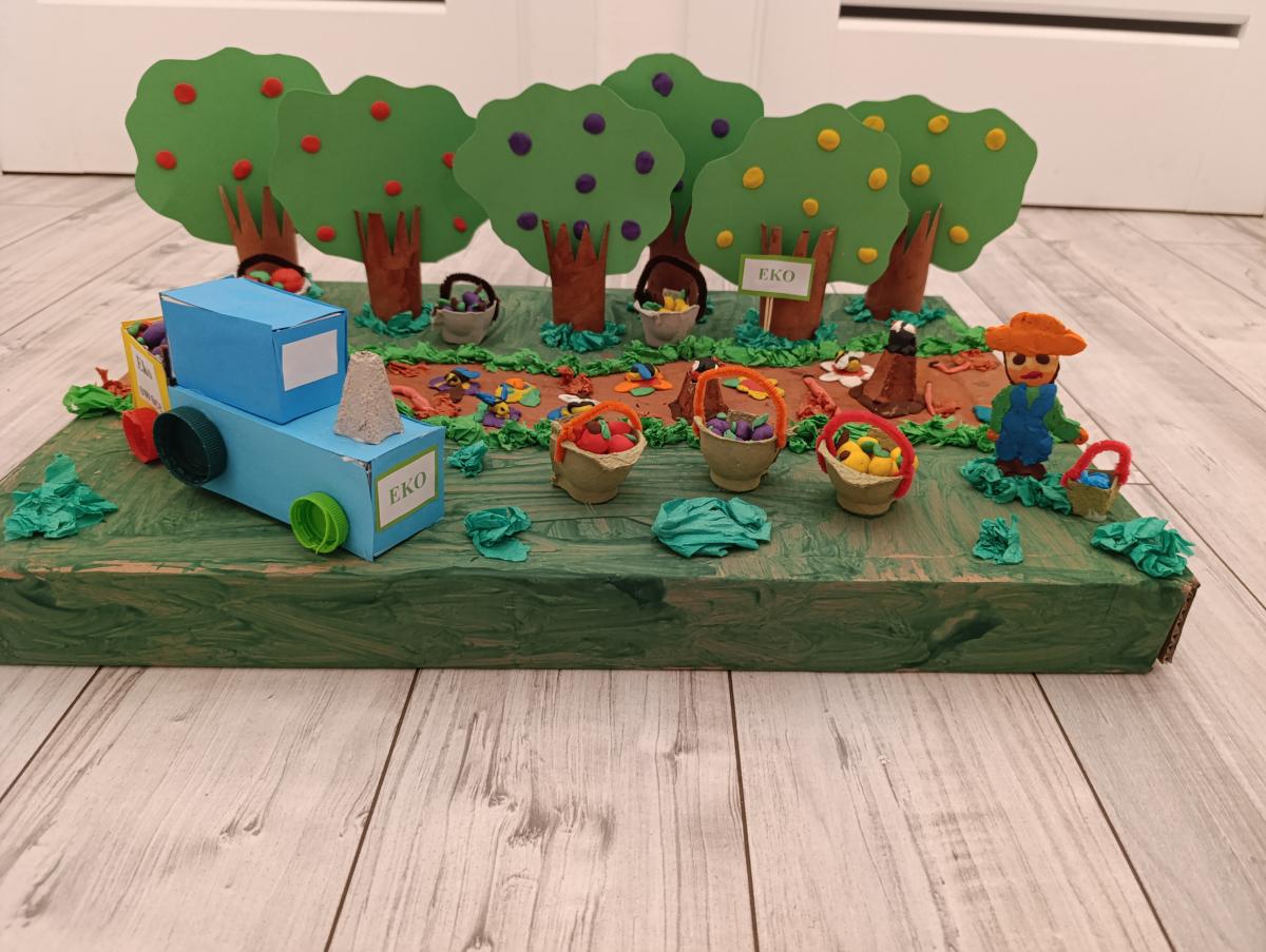 Dzieci z oddziału przedszkolnego wzięły udział w Powiatowym Konkursie Plastycznym pt. „Skąd się biorą owoce ekologiczne”. W ramach konkursu przedszkolaki wspólnie wykonały piękną i pomysłową makietę.