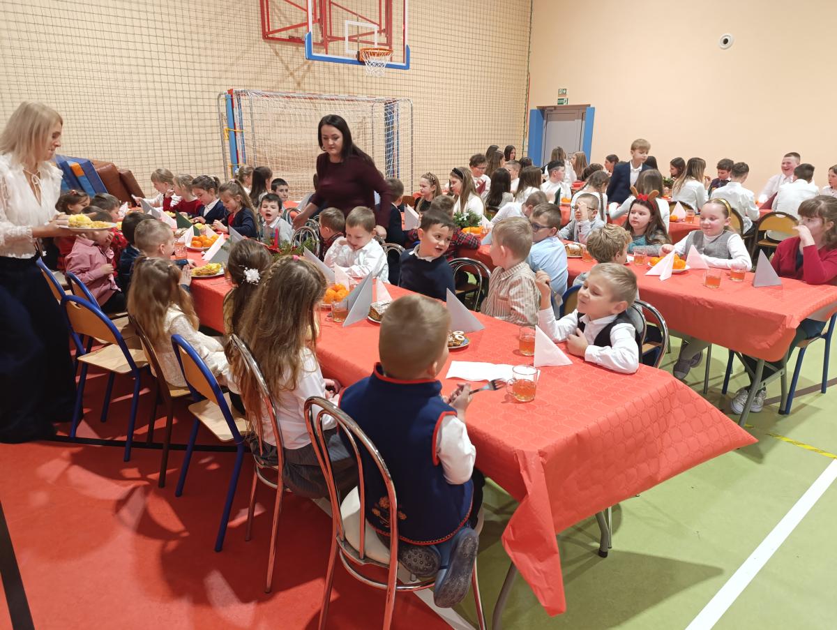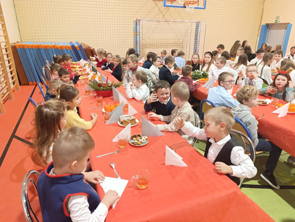 Po zakończeniu Jasełek odbyła się Wigilia Szkolna, podczas której uczestnicy składali sobie życzenia, dzielili się opłatkiem i wspólnie kolędowali. Spotkanie sprzyjało integracji całej społeczności szkolnej oraz pielęgnowaniu tradycji bożonarodzeniowych.
