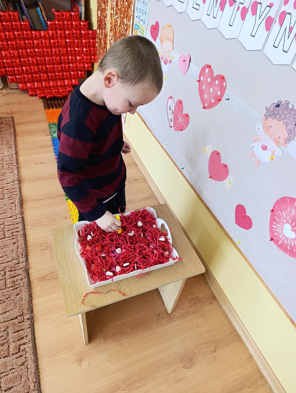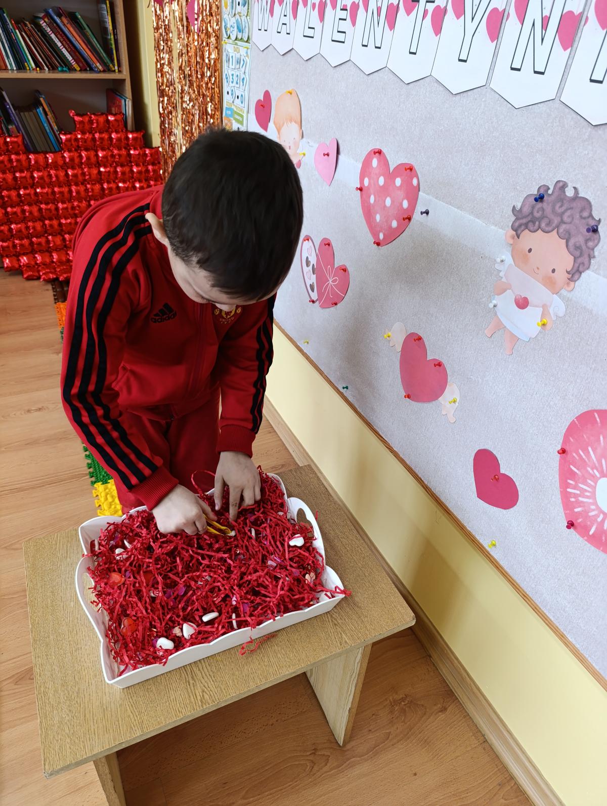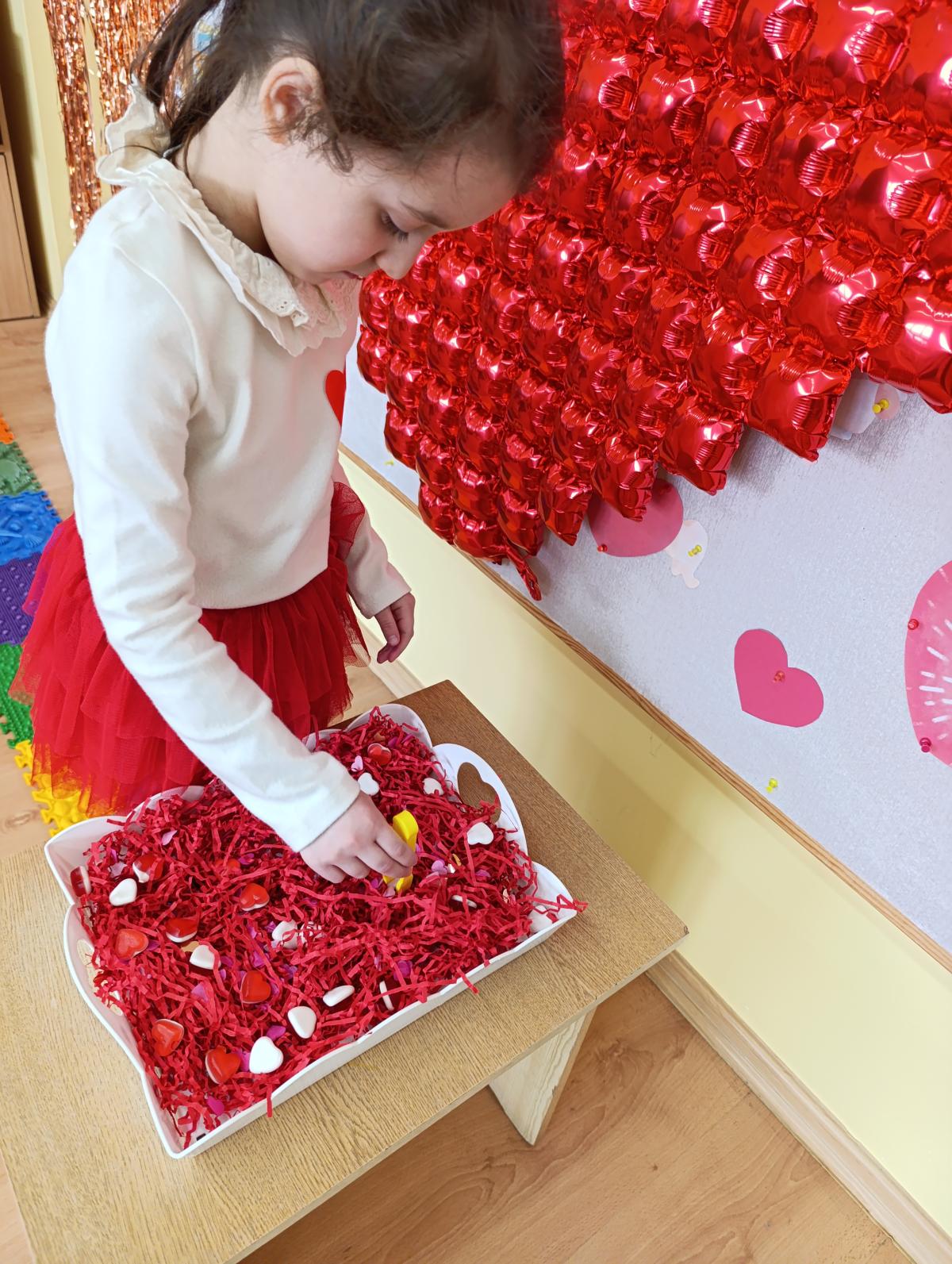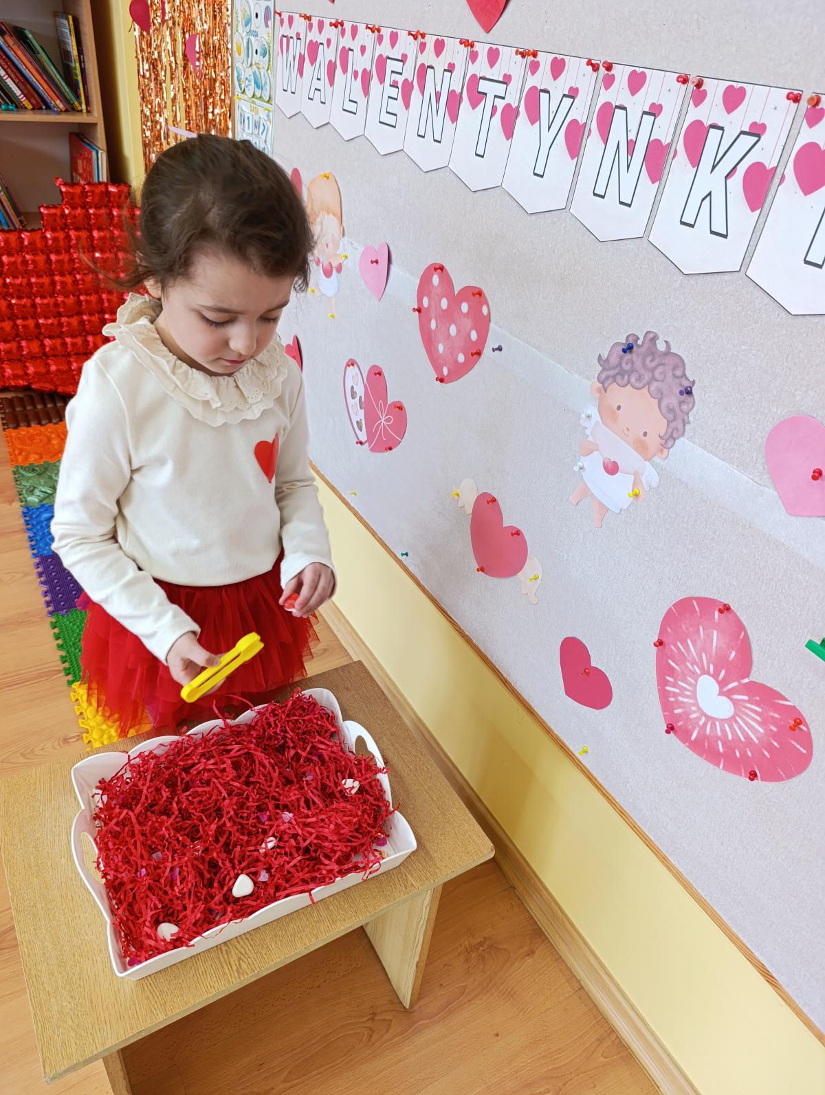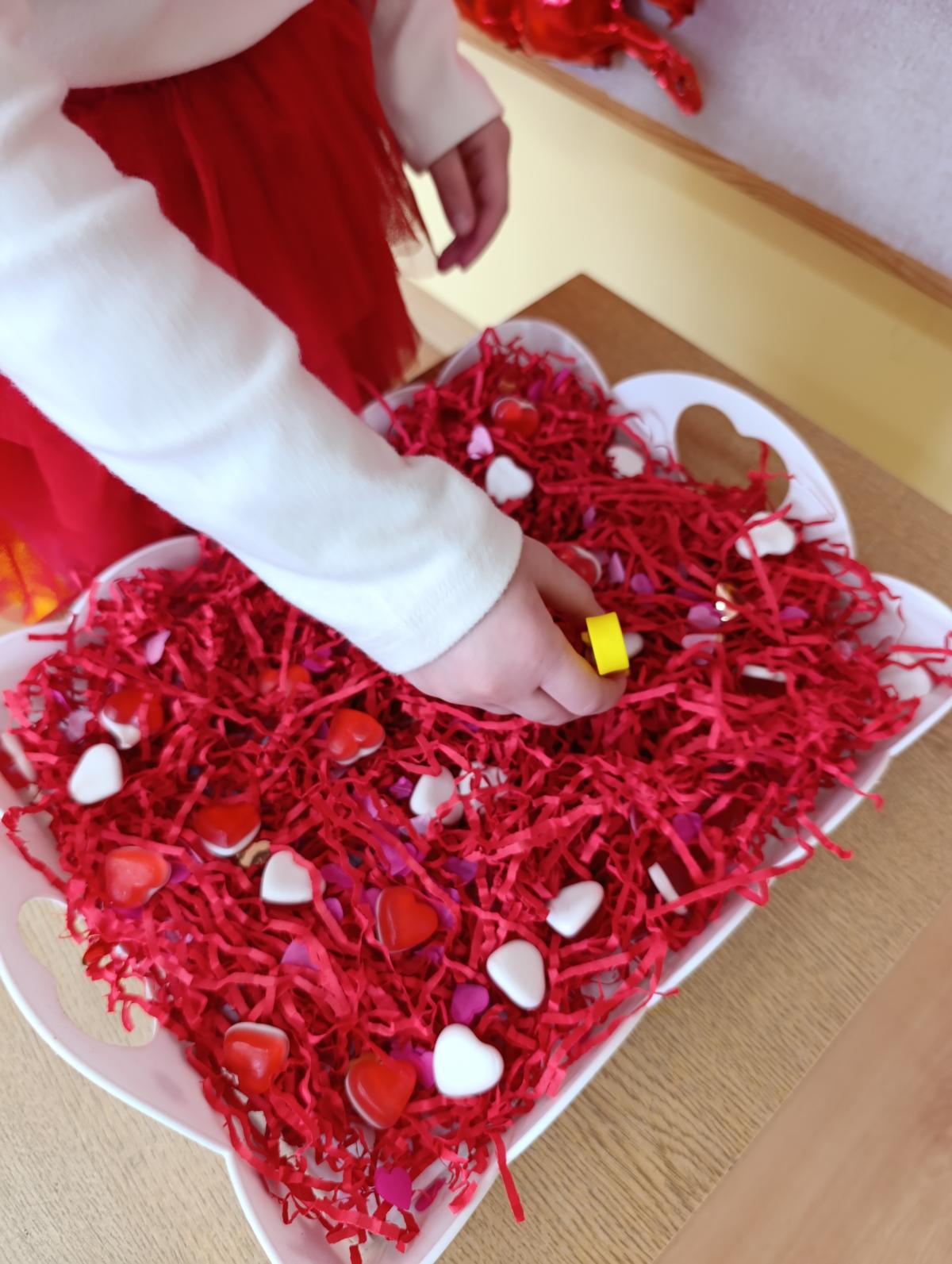 Nie zabrakło twórczych aktywności – mali artyści przygotowywali własne walentynki, które później wrzucali do specjalnej skrzynki. W trakcie dnia odbywały się również wesołe zabawy z serduszkami oraz zajęcia sensoryczne, które pobudzały wyobraźnię i zachęcały do wspólnej zabawy.