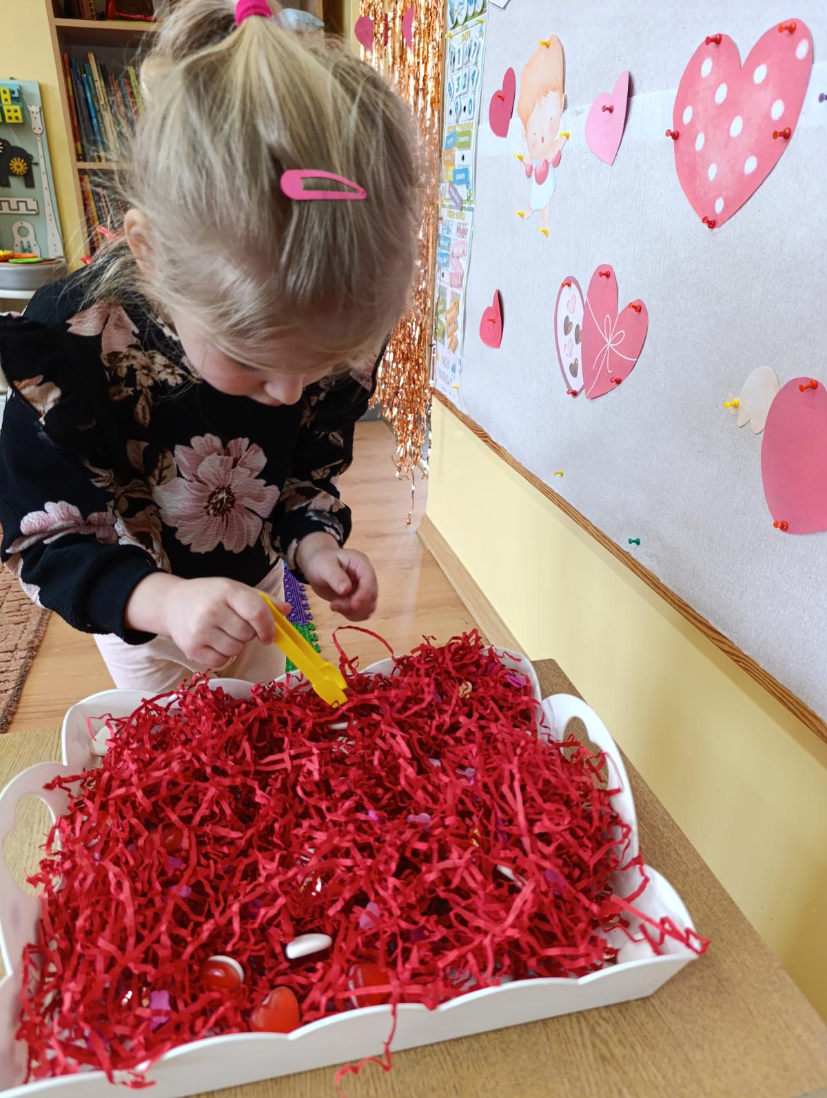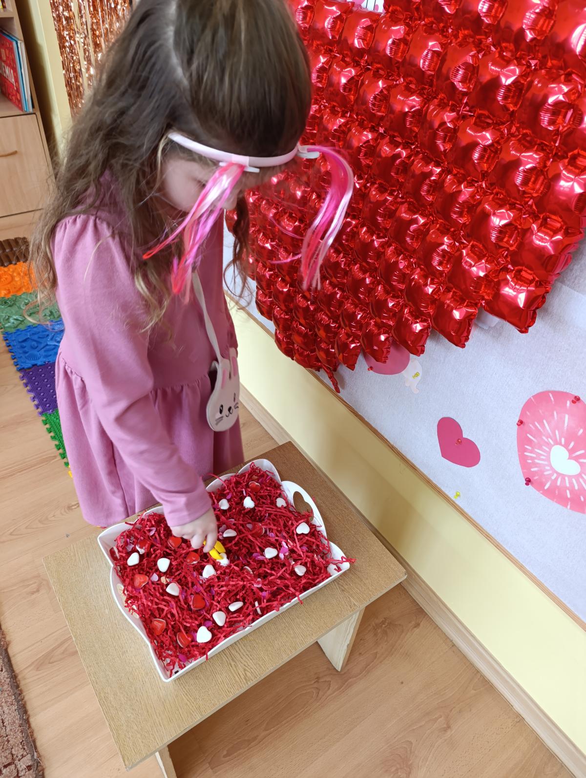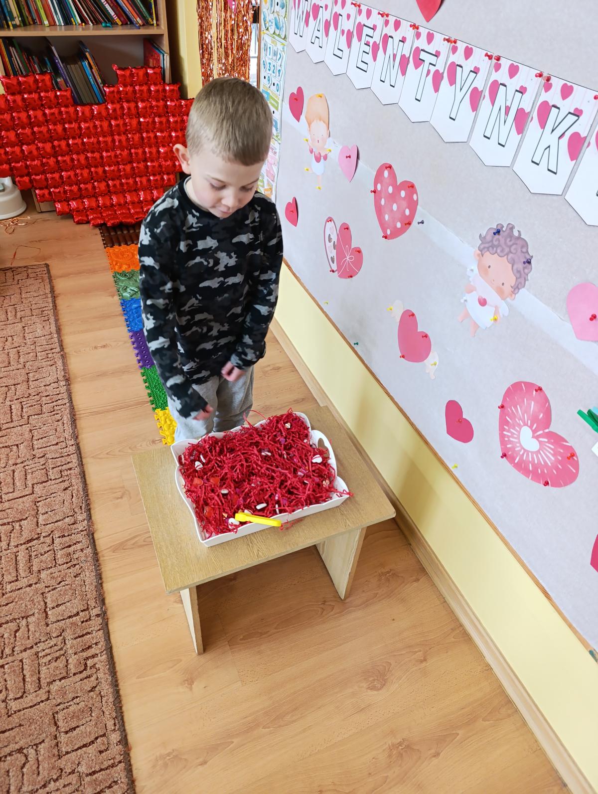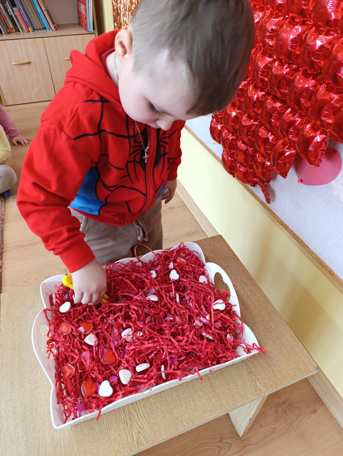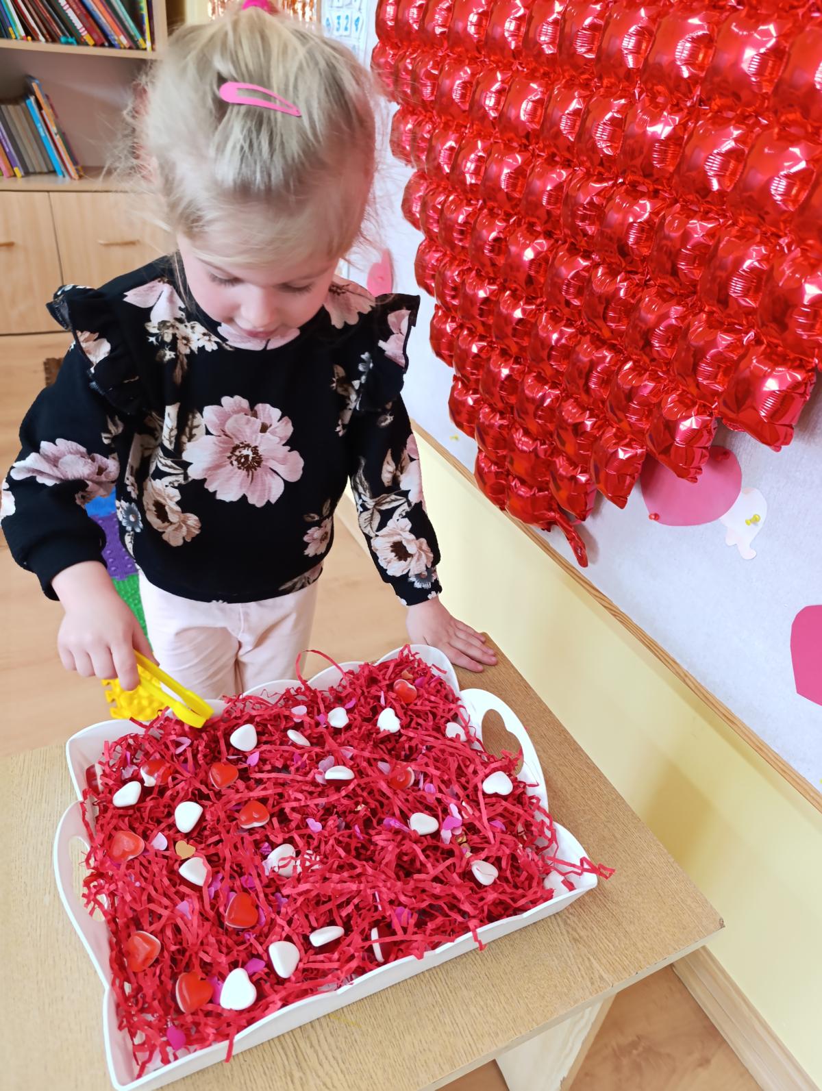 Nie zabrakło twórczych aktywności – mali artyści przygotowywali własne walentynki, które później wrzucali do specjalnej skrzynki. W trakcie dnia odbywały się również wesołe zabawy z serduszkami oraz zajęcia sensoryczne, które pobudzały wyobraźnię i zachęcały do wspólnej zabawy.