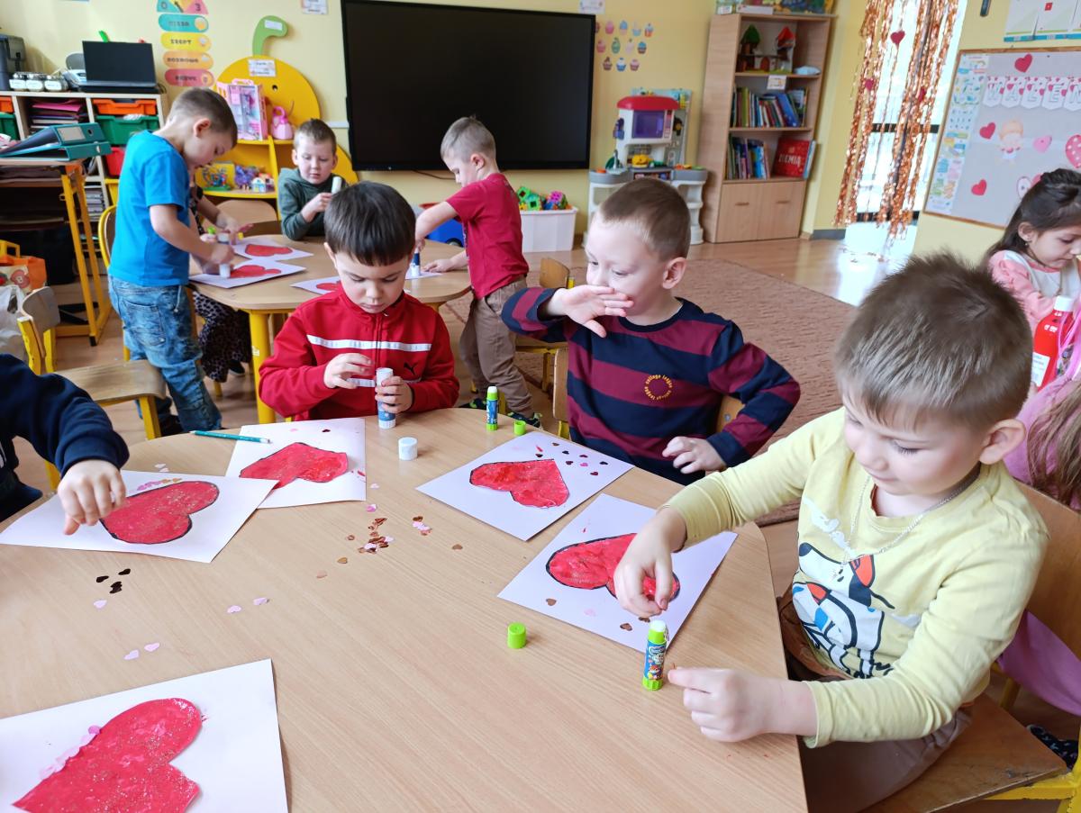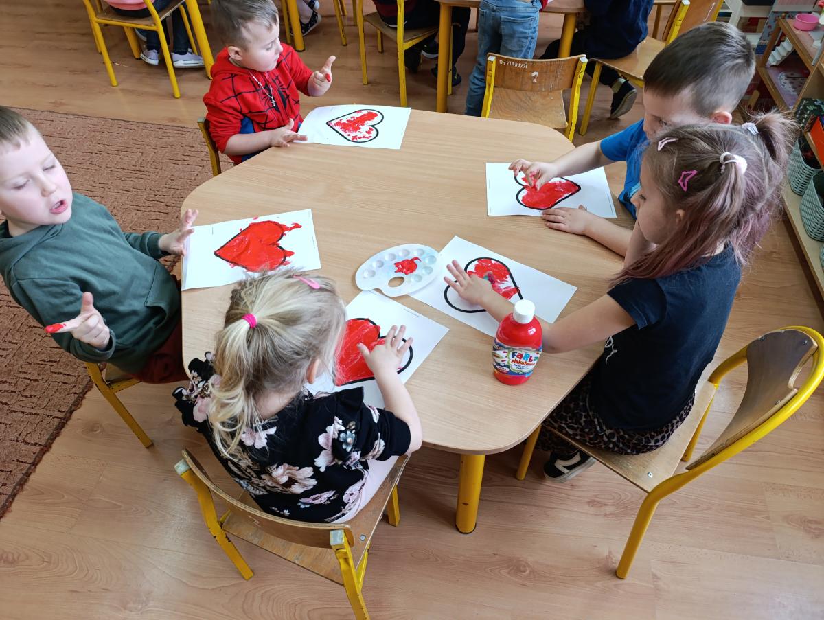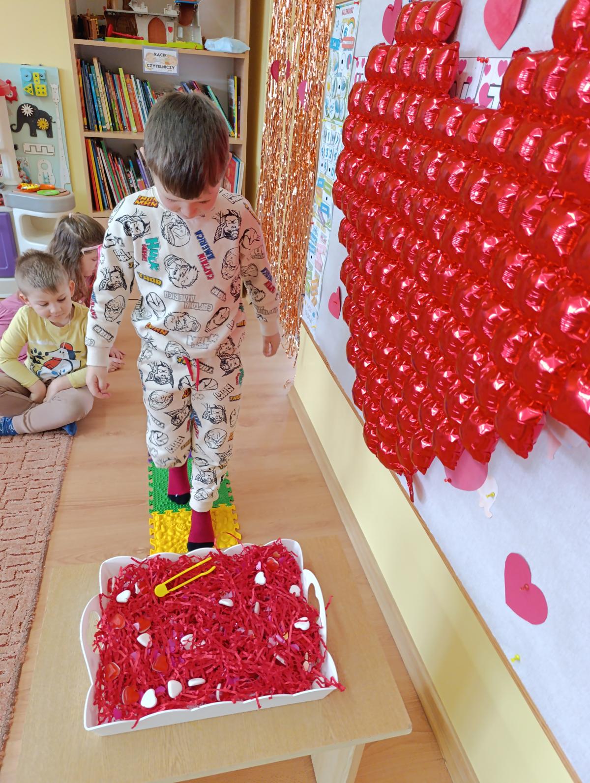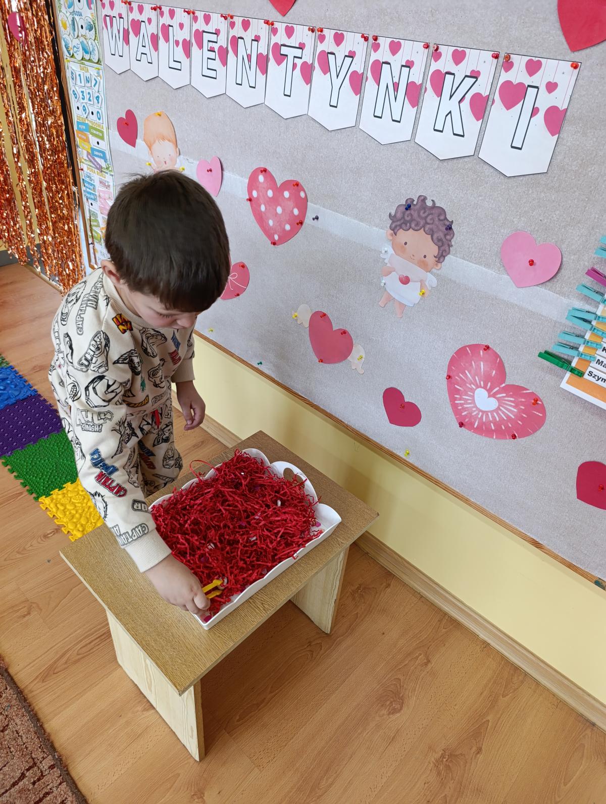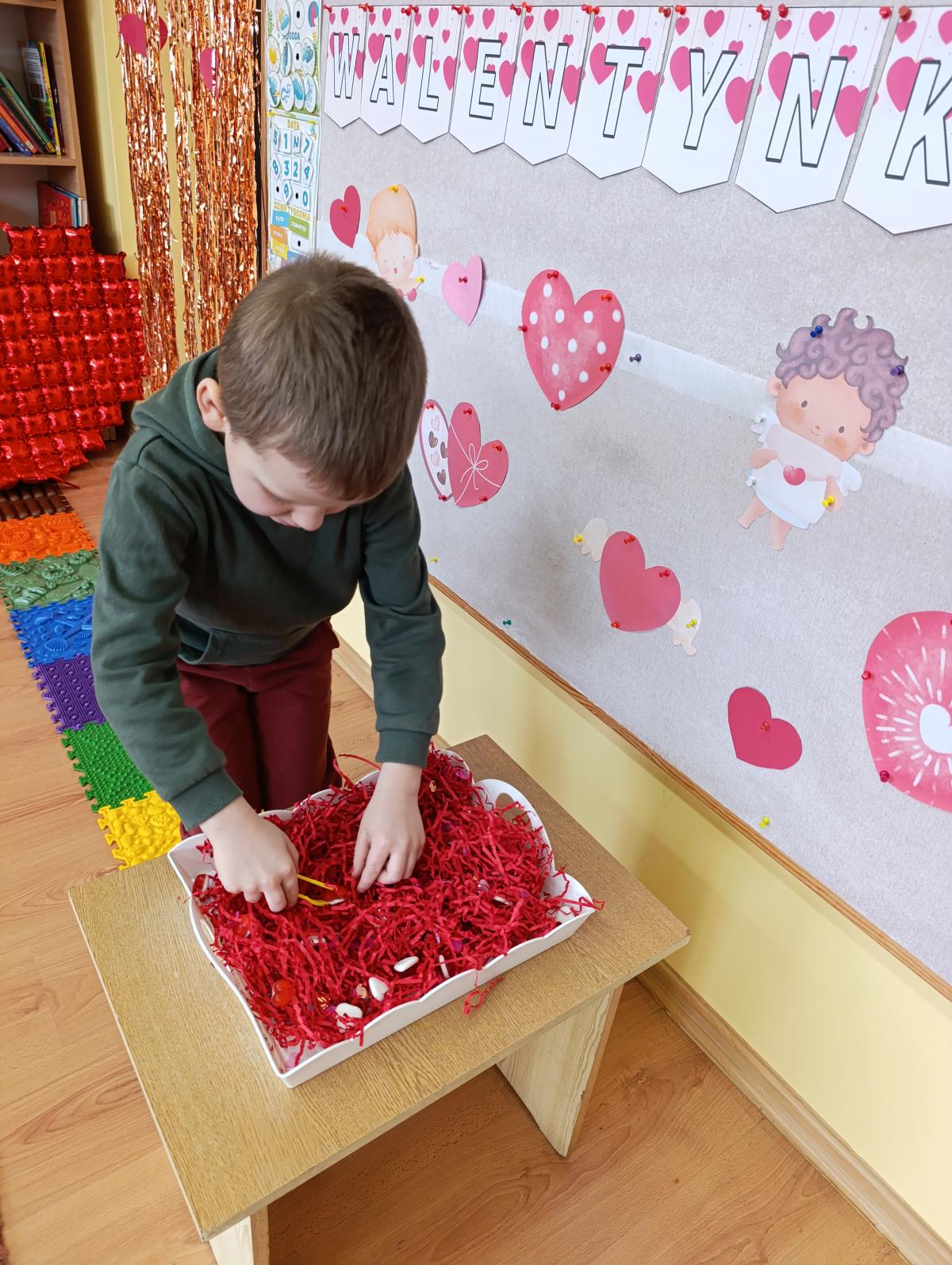 Nie zabrakło twórczych aktywności – mali artyści przygotowywali własne walentynki, które później wrzucali do specjalnej skrzynki. W trakcie dnia odbywały się również wesołe zabawy z serduszkami oraz zajęcia sensoryczne, które pobudzały wyobraźnię i zachęcały do wspólnej zabawy.